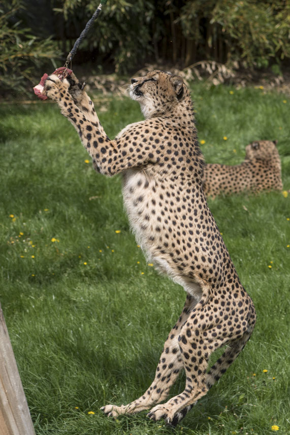 Die Wahl des Aprilausflugs ging zugunsten des Tierpark Herberstein aus. Da die Wettervorhersage mehr als bescheiden aussah, gab es im Vorfeld leider viele Absagen. Bereits vor einigen Jahren wurde ein Fotoausflug in den Mitte des 17. Jahrhundert gegründeten Park veranstaltet. Der Tierpark wurde aber erst Mitte der 1960er Jahre für die Öffentlichkeit zugängig gemacht. Um die Attraktivität für Besucher zu steigern wurde der Tierbestand mit „Exoten“ bereichert. Aus dieser Zeit stammt auch der weltweit erste Beutesimulator für Geparde, der auch gleich unser erstes Ziel war. Gut 20 Minuten vor Beginn der Fütterung harrte eine kleine, harte Truppe des Knipserklubs, mit Teleobjektiven bewaffnet, bei eisigem Wind vor dem Gehege aus, um den besten Fotopunkt zu ergattern. Und wir wurden nicht enttäuscht. Die Geparden bewegten sich wie Profis vor der Kamera. Sie gingen artig langsam auf die nun doch zahlreichen Besucher zu und schienen immer wieder brav für die Kameras zu posieren. Als dann aber das Fleisch mit dem besagten Beutesimulator = ein umgebauter Schilift ;-) kam, waren wir froh hinter dem Zaun zu stehen…