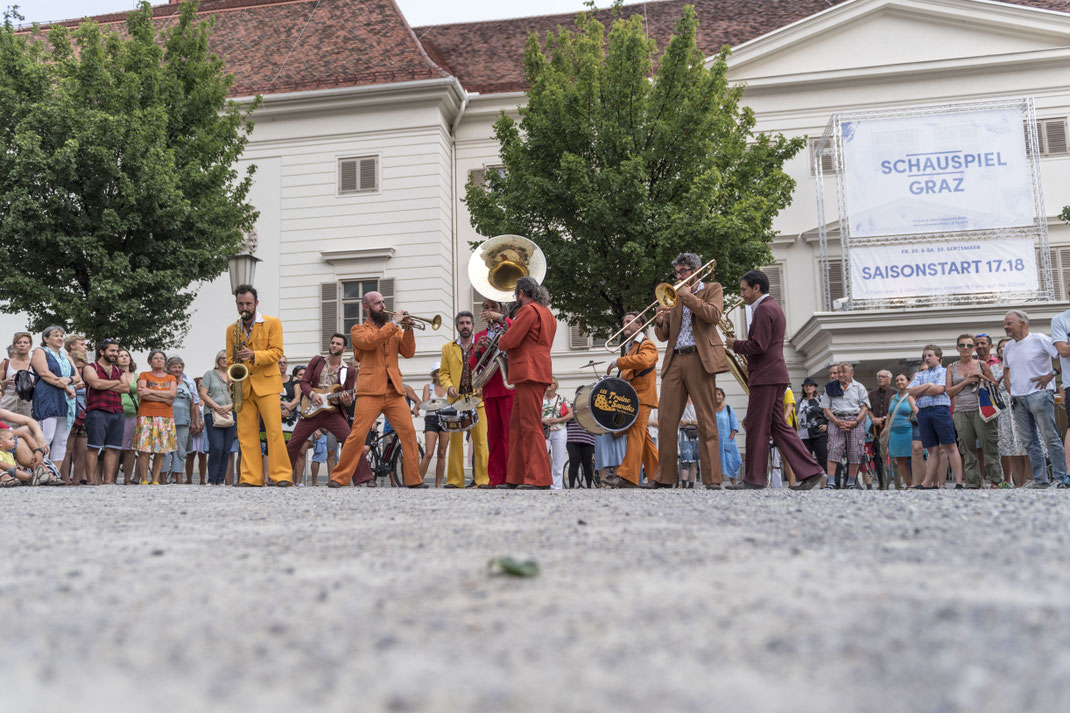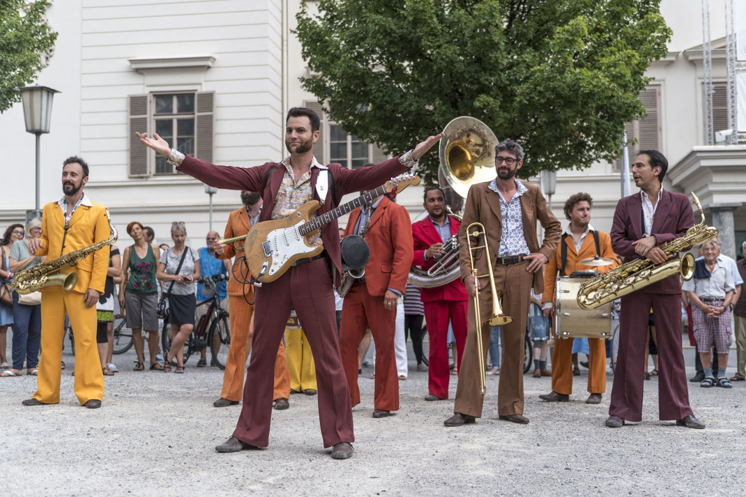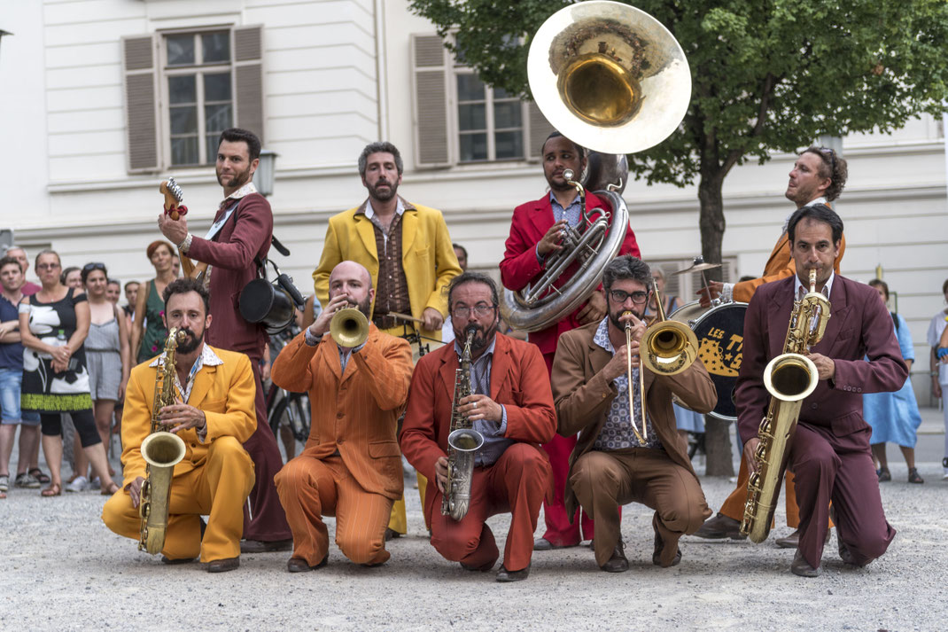 Auf dem Weg zum zweiten Programmpunkt, Les Traine- Savates, haben wir uns noch mit einem Eis abgekühlt. Am Freiheitsplatz warteten bereits unzählige Menschen auf den Auftritt der französischen Band. Wir mussten nicht lange warten, bevor uns die 9 Musiker in ihren bunten Kostümen und mit ihrem Feuerwerk aus Brass- und Funkmusik zum Tanzen brachten. Wir blendeten die heißen Temperaturen aus und begannen uns, nicht gerade vorteilhaft zum Fotografieren, rhythmisch zur Musik zu bewegen. Mit einem tosenden Applaus endete nach knapp einer Stunde die Vorführung.