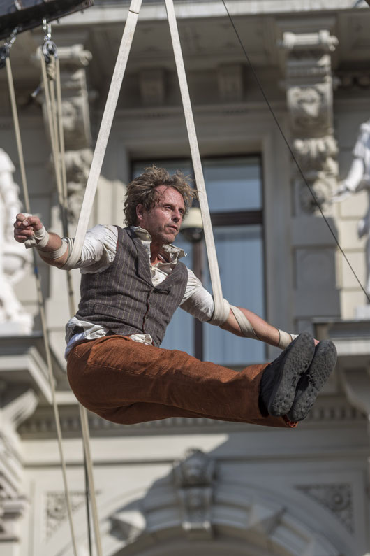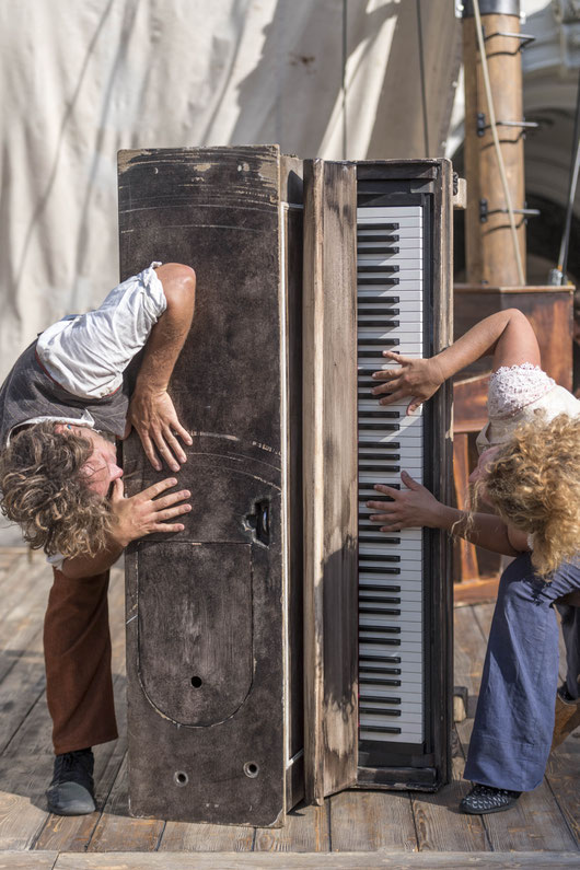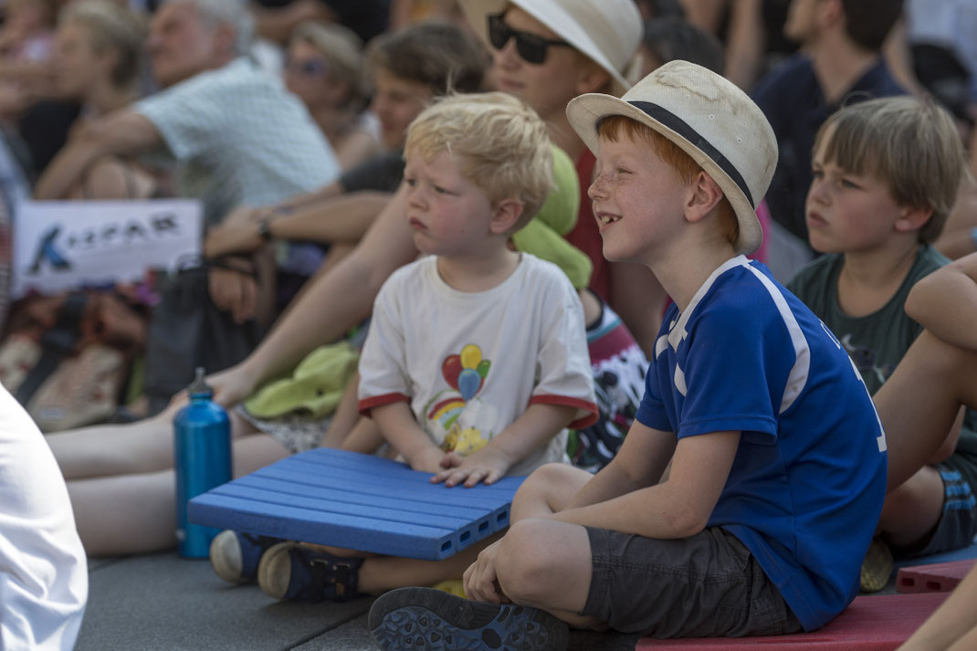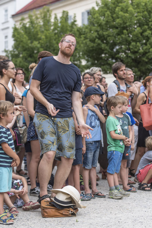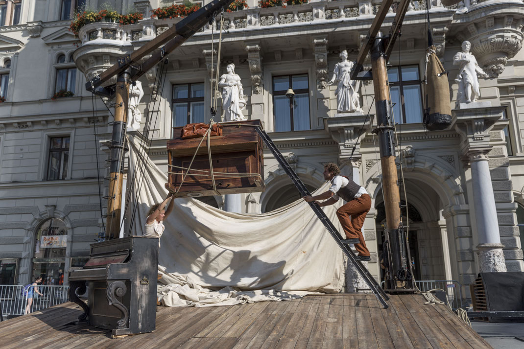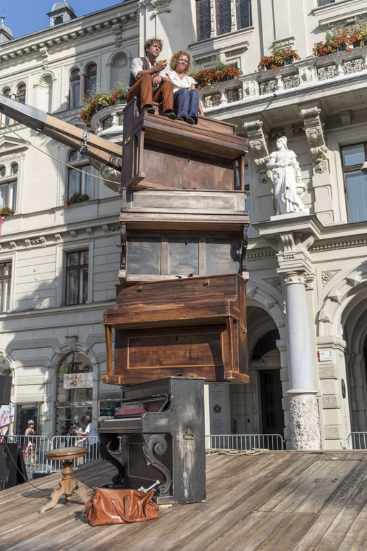 Bei fast unerträglichen 35 Grad haben wir uns am Hauptplatz zur Vorführung von d’irque & fien, einem belgisch-französische Duo, eingefunden. Das spektakuläre Programm versuchte Zirkus-Profession abseits der Manege mit der Liebe zur Musik zu verbinden. So wurden Klaviere zu Turngeräten umfunktioniert, durch die Luft gehievt und übereinander gestapelt. Ohne ein einziges Wort zu sprechen, schafften sie durch ihren waghalsigen Stunts, aber auch durch ihre (gespielte) Tollpatschigkeit, Groß und Klein in ihren Bann zu ziehen. Nach knapp 45 Minuten war die tolle Vorstellung zu Ende und wir bereit für ein kühles Getränk.