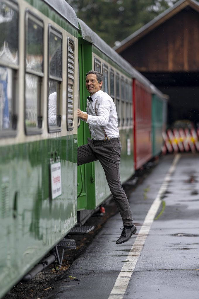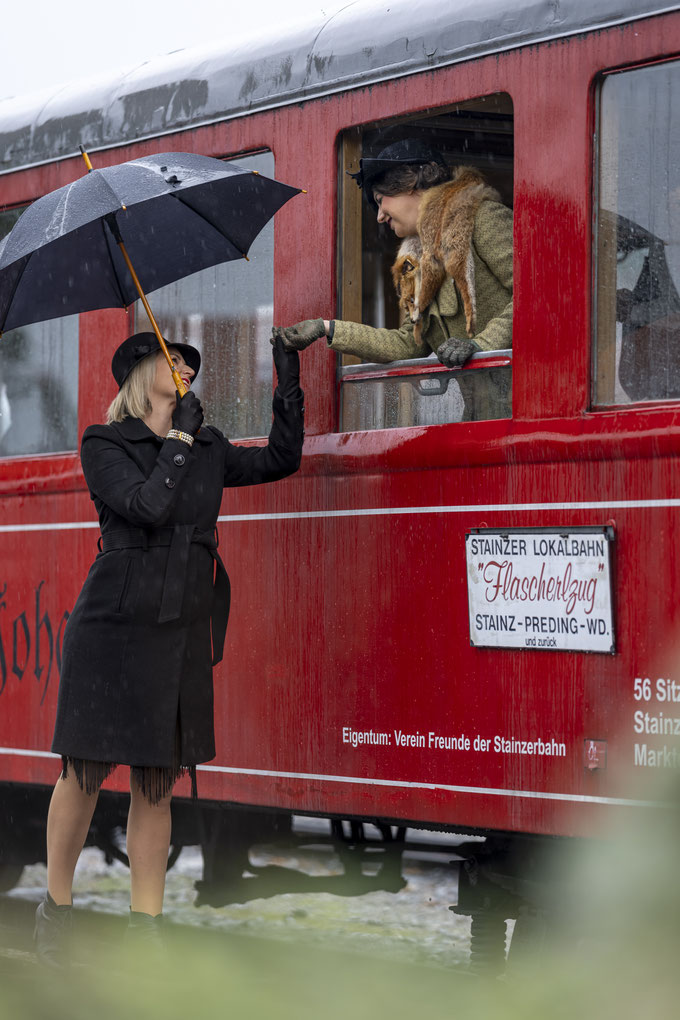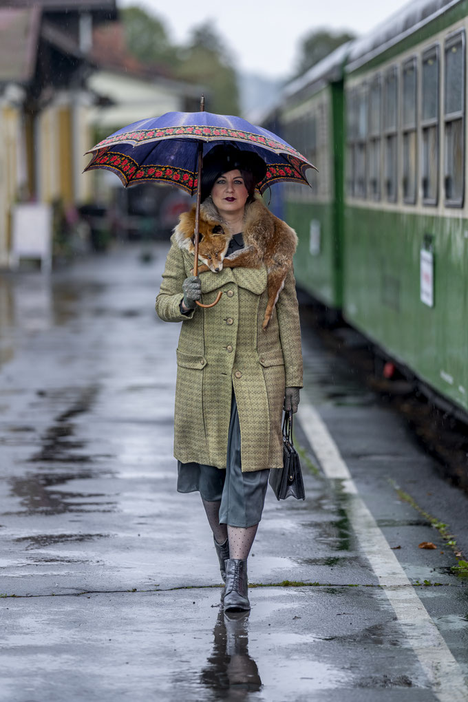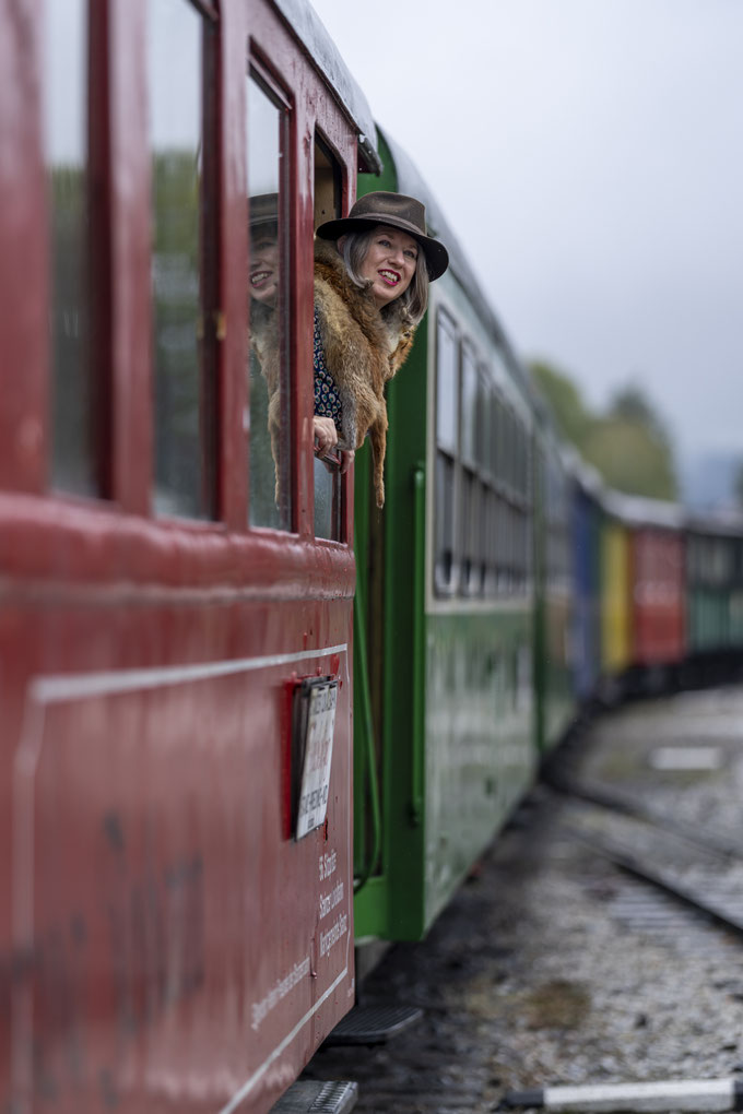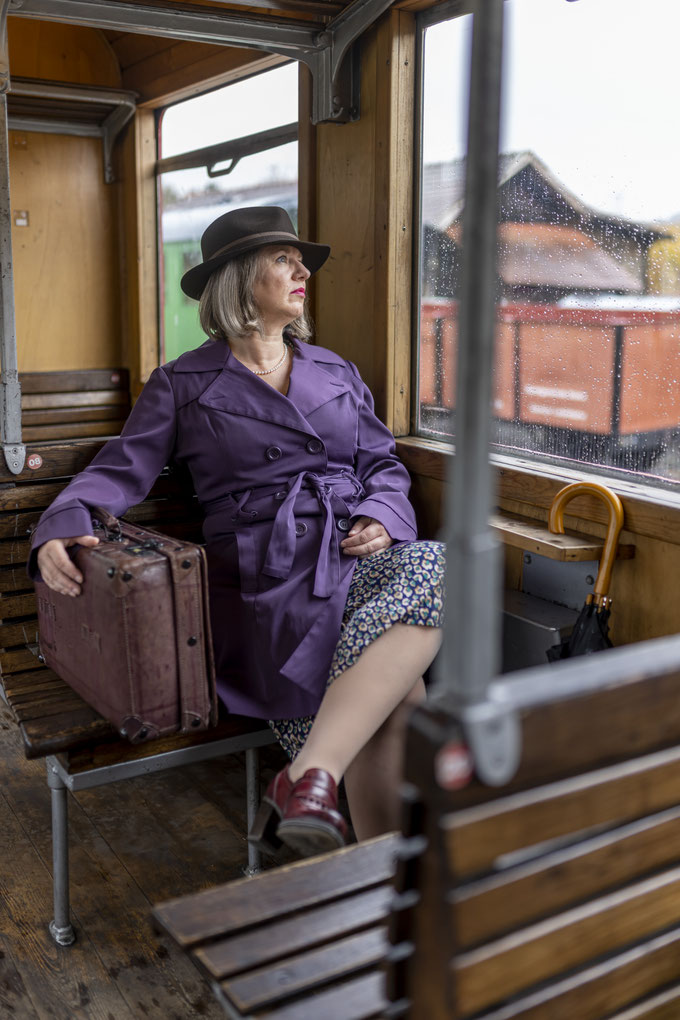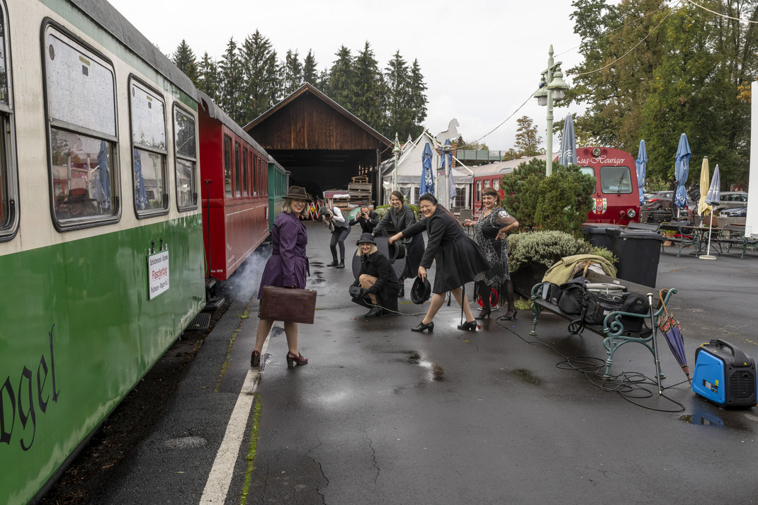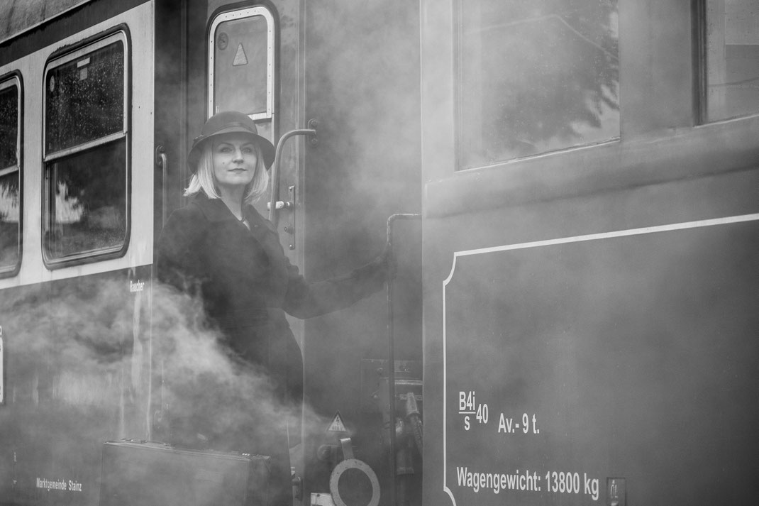 Nach kurzer Rücksprache mit der Fahrleitung, starteten wir dann auch schon mit dem Shooting. An dieser Stelle gleich ein großes Danke an das Team des Stainzer Flascherlzugs, dass wir uns frei durch das Gelände und die Wagons bewegen durften. Da es noch regnete, begannen wir in den Wagons mit den Porträts. Wir brauchten am Anfang ein wenig Zeit bis wir uns aufgeteilt haben, denn diesmal waren alle 8 Teilnehmer Modells aber nicht alle 8 auch Fotografen. Jeder hatte schon einige Bilder im Kopf, welche nun umgesetzt werden sollten. Neben den Porträts im Zug oder der Spaziergang am Bahnsteig durfte eine klassische Verabschiedungsszene auch nicht fehlen. Unsere Modells fühlten sich in ihren Rollen sehr wohl und hatten sichtlich Spaß beim Shooting. Exakt führten sie alle Anweisungen der Fotografen aus und fügten mit ihren eigenen Interpretationen der Szenen auch noch da und dort ihre persönliche Note hinzu. Nach knapp 2 Stunden machten nicht nur der Regen sondern auch wir eine Pause.