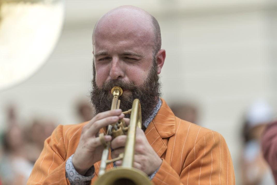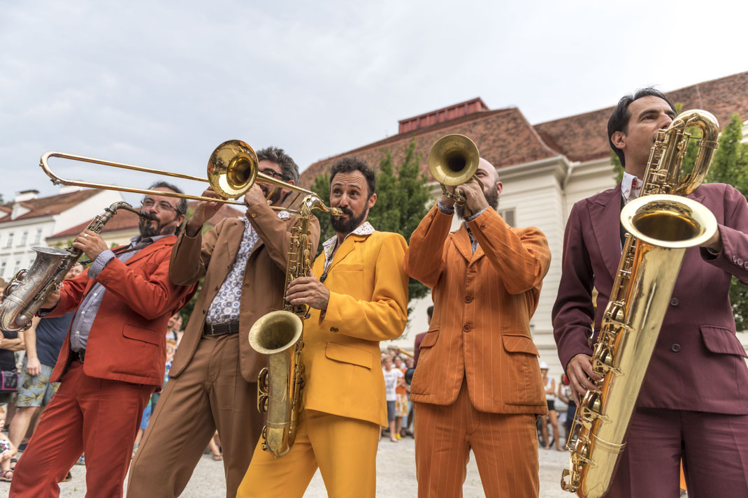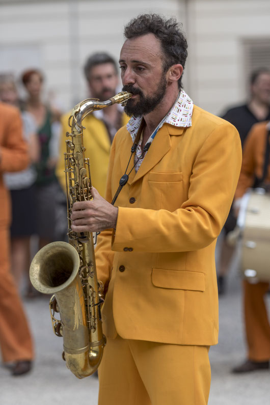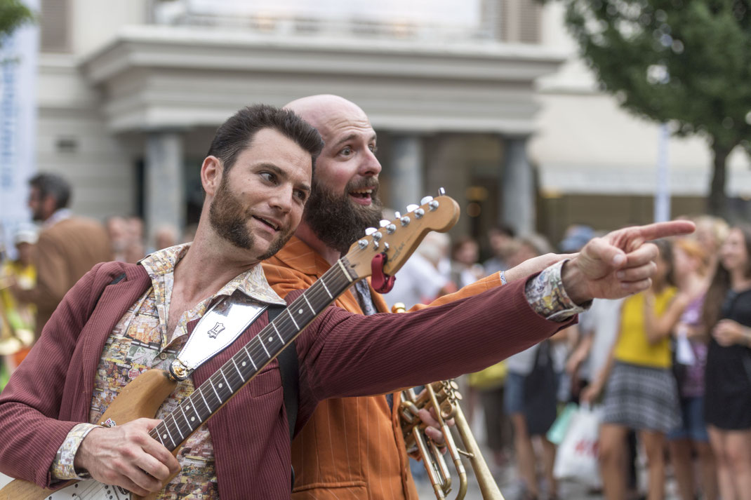 Auf dem Weg zum zweiten Programmpunkt, Les Traine- Savates, haben wir uns noch mit einem Eis abgekühlt. Am Freiheitsplatz warteten bereits unzählige Menschen auf den Auftritt der französischen Band. Wir mussten nicht lange warten, bevor uns die 9 Musiker in ihren bunten Kostümen und mit ihrem Feuerwerk aus Brass- und Funkmusik zum Tanzen brachten. Wir blendeten die heißen Temperaturen aus und begannen uns, nicht gerade vorteilhaft zum Fotografieren, rhythmisch zur Musik zu bewegen. Mit einem tosenden Applaus endete nach knapp einer Stunde die Vorführung.