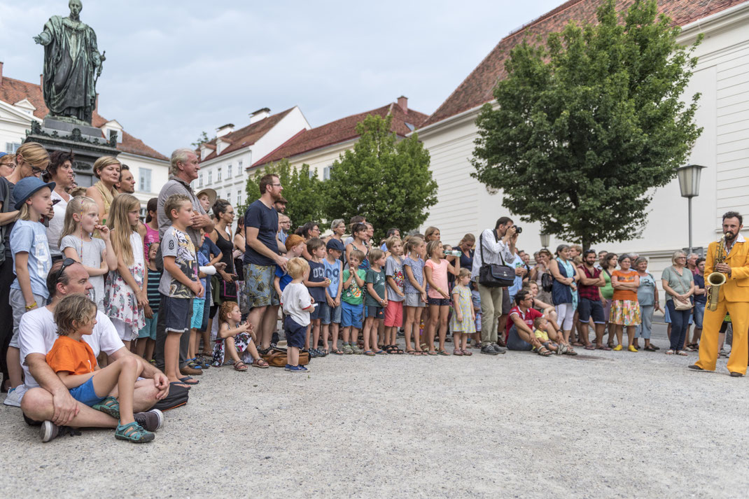 Bei fast unerträglichen 35 Grad haben wir uns am Hauptplatz zur Vorführung von d’irque & fien, einem belgisch-französische Duo, eingefunden. Das spektakuläre Programm versuchte Zirkus-Profession abseits der Manege mit der Liebe zur Musik zu verbinden. So wurden Klaviere zu Turngeräten umfunktioniert, durch die Luft gehievt und übereinander gestapelt. Ohne ein einziges Wort zu sprechen, schafften sie durch ihren waghalsigen Stunts, aber auch durch ihre (gespielte) Tollpatschigkeit, Groß und Klein in ihren Bann zu ziehen. Nach knapp 45 Minuten war die tolle Vorstellung zu Ende und wir bereit für ein kühles Getränk.